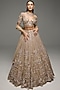 Featuring a gold lehenga net with sequins and crystal hand embroidery. It is paired with an embroidered blouse and a dupatta. Accentuate the designer lehenga with statement jewellery and heels for a wedding, engagement or sangeet ceremony.