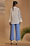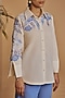Featuring an ivory shirt in linen blend base with a chic spread collar, curved hemline, cuffed sleeves, and embroidery. It is paired with blue straight pants having side slits. Accentuate with minimal jewellery and heels for an evening soiree or a brunch.
