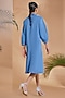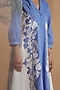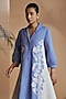 Featuring a blue and ivory midi A-line dress in linen blend base with lantern sleeves, notch collar, and delicate embroidery. Accentuate with minimal jewellery and heels for an evening soiree or a brunch.