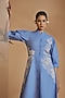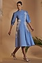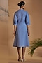 Featuring a blue midi dress in linen blend base with mandarin collar, pleated puffed sleeves, and embroidery. Accentuate with minimal jewellery and heels for an evening soiree or a brunch.