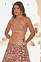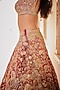 Featuring a cut ruby colored trail lehenga in organza base with handcrafted zardosi, french knots, applique and thread embroidery. It is paired with a bustier. Style it with block heels, polki earrings and a sleek braid for a regal look. Ideal for a sangeet ceremony or weddings.