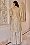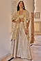 Featuring a frost champagne jacket in tissue silk base with zardosi, french knot, aari and applique hand embroidery. It is paired with an inner and gharara pants. Style it with heavy jewellery and block heels, perfect for wedding ceremonies or festive occasions.