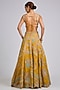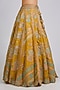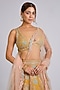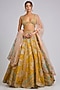 Featuring a honey gold handcrafted lehenga in organza base with can-can, zardosi, multi-colored applique, french knots and aari work. It is paired with an embroidered blouse and a dupatta. Accentuate it with traditional kundan or polki statement jewellery, a matching potli bag, and elegant heels for a stylish ensemble, ideal for wedding functions, engagement ceremonies or grand festive celebrations.