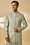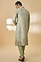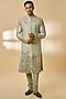 Featuring a sage green sherwani in silk base. It is paired with a kurta and pants. Style it up with mojaris and malas for a wedding or engagement ceremony.