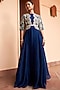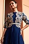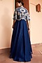 Featuring a midnight blue jacket in mulberry and organza base with handcrafted zardosi, thread and french knot embroidery. It is paired with an inner dress and a belt. Accentuate it with heels and dangler earrings for a festive look.