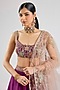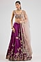 Featuring a plum lehenga in mulberry silk base. It is paired with a blouse and a dupatta. Style it with statement jewellery and heels for a wedding, engagement or sangeet ceremony.