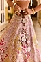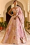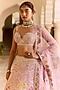 Featuring a rosaline pink lehenga in raw silk base with zardosi, french knot, applique and dori hand embroidery. It is paired with a blouse and a dupatta. Style it with heavy jewellery, block heels and a clutch, perfect for a bridal look.