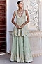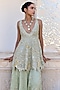 Featuring a sage green peplum top in satin silk base with zardosi, french knot and aari hand embroidery. It is paired with gharara pants. Style it with heavy jewellery and block heels, perfect for wedding ceremonies or festive occasions.