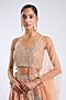 Featuring a salmon peach lehenga in tissue silk base, handcrafted with zardosi, french knots, aari and multi-coloured applique embroidery. It is paired with a blouse and a dupatta. Style it with heavy jewellery and block heels, perfect for wedding ceremonies or festive occasions.