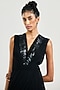 Tarun Tahiliani features a black jumpsuit in crinkle base with embroidered neck. Accentuate it with minimal jewellery and heels for evening wear.