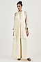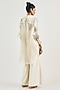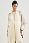 Tarun Tahiliani features an ivory oversized tunic in satin organza base with handstitched kantha detail and concealed half placket. Accentuate it with pants, minimal jewellery and heels for evening wear.
