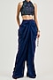 Tarun Tahiliani features navy pants in satin base. Accentuate it with a top, minimal jewellery and heels for evening wear.