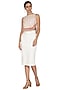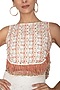 Featuring a white and red crop top in cotton cambric schiffli base with attached fringe and embroidery.