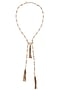 Featuring a rose gold plated pendant necklace handcrafted with clear cubic zirconia crystals and gold tassels, set in base metal.