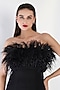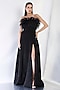 Featuring a black strapless maxi dress in neoprene base with a slit and panel detail. It is paired with a feather wrap. Accentuate it with statement earrings and heels for a cocktail soiree or an after-party look.