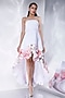 Featuring an off-white high-low dress in neoprene base with floral print. It is paired with a wrap. Style it with statement earrings, strappy heels, and a sleek clutch for a chic look. Perfect for cocktail parties, date nights, vacations, brunches, and evening celebrations.