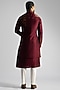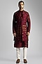 Featuring a deep red long indowestern jacket in bemberg silk and cotton base with embroidery. It is paired with a kurta and pants. Perfect wear for an engagement or sangeet ceremony.