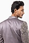 Featuring a grey indowestern jacket in linen satin base with bird embroidery and leather cord detailing. It is paired with pants. Accentuate it with sleek black loafers or embroidered juttis and statement sunglasses for a sharp ensemble, ideal for cocktail evenings, sangeet nights or contemporary wedding receptions.