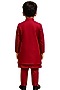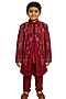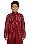 Featuring a crimson red nehru jacket for boys in linen satin base with mirror embroidery. It is paired with a kurta and malai cotton trousers. Style it with a watch and juttis for a festive occasion or pooja ceremony.