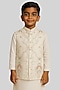Featuring an ivory nehru jacket for boys in linen satin base with floral embroidery. It is paired with a kurta and malai cotton churidar pants. Style it with a watch and juttis for a festive occasion or pooja ceremony.