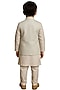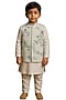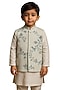 Featuring an ivory and water blue nehru jacket for boys in bam silk base with floral embroidery. It is paired with a kurta and malai cotton pants. Style it with a watch and juttis for a festive occasion or pooja ceremony.