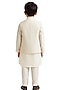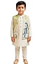 Featuring a mint green nehru jacket for boys in organza base with botanical motif hand embroidery. It is paired with a chanderi kurta and ivory trousers. Style it with a watch and juttis for a festive occasion or pooja ceremony.