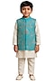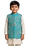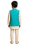 Featuring a turquoise nehru jacket for boys in bam silk base with motif embroidery. It is paired with a kurta and malai cotton pyjama pants. Style it with a watch and juttis for a festive occasion or pooja ceremony.