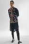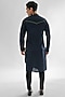 Featuring a midnight blue nehru jacket in linen satin base with thread work. It is paired with a matching asymmetrical kurta and malai cotton pyjama pants.