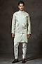 Featuring a mint green bundi jacket in linen satin base with pichwai embroidery and dabka highlights. This contains only one piece.