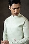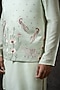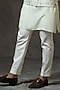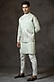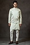 Featuring a mint green bundi jacket in linen satin base with pichwai embroidery and dabka highlights. It is paired with a matching linen satin kurta and contrasting cream malai cotton pyjama pants.