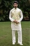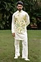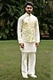 Featuring a mint green bundi jacket in linen satin base with hand embroidery. It is paired with a kurta and pants. Perfect for a festive occasion, mehendi, wedding or engagement ceremony, exuding traditional charm and elegance.
