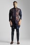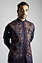 Featuring a navy blue nehru jacket in velvet base with multi-colored embroidery and panel detailing on the centre. Style it with a kurta and pants for an engagement, mehendi, haldi, or sangeet ceremony.