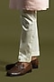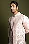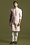 Featuring a pink nehru jacket in chanderi silk base with chirwork and french knot motifs. It is paired with a floral embroidered linen satin kurta and cotton pants. Perfect wear for festive occasions.