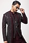 Featuring a wine double-panel indowestern jacket in stretchable base with sequins and dori embroidery. It is paired with pants. Accentuate it with sleek black loafers or embroidered juttis and statement sunglasses for a sharp ensemble, ideal for cocktail evenings, sangeet nights or contemporary wedding receptions.