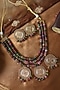 Featuring a 22kt gold plated necklace studded with multi-colored tourmaline stone, embossed temple units and adjustable dori closure, set in mixed metal. It is paired with a matching pair of earrings having a push-back closure. Perfect for weddings, festive celebrations and grand occasions.