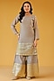 Featuring a grey kurta in pure soft chanderi base with gold gota embroidery. It is paired with sharara pants and a pure chanderi dupatta. Accentuate it with dangler earrings and heels for a festive occasion or pooja ceremony.
