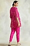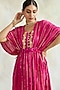 Featuring a hot pink kaftan in soft rayon crepe base with drawstrings, print, and embroidered neckline. It is paired with matching soft cotton pants.