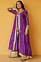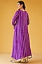 Featuring a royal purple jacket in rayon crepe base with gota hand embellishments. It is paired with a cotton inner dress and palazzo pants. Accentuate it with dangler earrings and mojaris for a festive occasion or pooja ceremony.