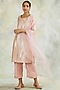 Featuring a salmon pink kurta in soft cotton silk base with hand embroidery. It is paired with matching elasticated pants and a chiffon dupatta having antique gold accent at the edge.