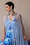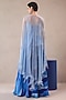 Featuring a sky blue cape in chiffon base with hand embroidery. It is paired with an atlantic blue silk blend front slit dress having lehar print. Accentuate it with statement jewellery and block heels for evening soirees.