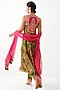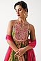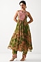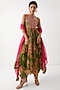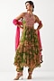 Featuring an avocado green tiered kurta in chiffon base with print and zardosi embroidery. It is paired with silk blend poncho pants and a rani pink chiffon dupatta. Team with up dangler earrings and stilettos, great for wedding or festive ceremonies.