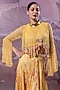 Featuring a butter yellow boho top in chiffon base with flared sleeves, print and cutwork hand embroidery. It is paired with a printed silk blend skirt and a belt. Style it with pearl or kundan jewellery and soft glam makeup for a graceful finish, Perfect for festive celebrations, haldi functions, or intimate wedding ceremonies.