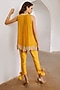 Featuring a marigold yellow tunic in chiffon base with print and cutdana embroidery. It is paired with chanderi bow pants. Accentuate it with statement jewellery and heels for a festive look.