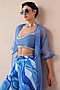 Featuring an ocean blue jacket in organza base. It is paired with a chanderi top having cutdana hand embroidery, a belt and atlantic blue silk blend lehar printed pants. Accentuate it with statement jewellery and block heels for evening soirees.