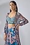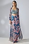 Featuring a prussian blue cape in chiffon base with print and embroidery. It is paired with a chanderi corset blouse and a modal draped skirt. Accentuate it with statement jewellery or heels for a cocktail, sangeet or engagement ceremony.