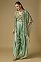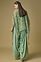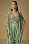 Featuring an aqua blue cape in georgette and satin base with hand work. It is paired with a blouse and a dhoti. Accentuate it with dangler earrings and block heels for festive occasions or cocktail ceremony.