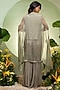 Featuring an aqua cape in organza and chiffon base with embroidery. It is paired with a waistcoat and sharara pants. Accentuate with statement jewellery and heels for a festive occasion.
