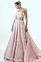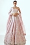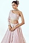 Featuring a pink lehenga in organza base with resham, moti and thread work. It is paired with an one-shoulder blouse and a dupatta. Accentuate it with statement jewellery and heels for a wedding or sangeet ceremony.