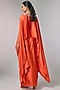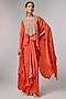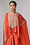 Featuring a rust cape in satin base with zardosi hand work. It is paired with a skirt. Accentuate it with dangler earrings and block heels for festive occasions or sangeet ceremony.