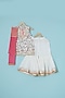 Featuring a white kurta for girls in cambric cotton base with gota lace detailing and floral hand block print. It is paired with matching modal silk gharara pants and a pink choker dupatta.